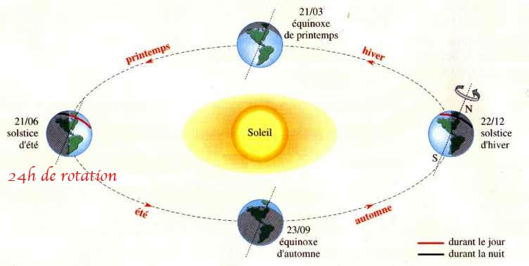 Ce qui explique les 12h de décalage entre l’hivers et l’été et que l’Amérique du sud (par exemple sur le schéma) à midi sera toujours face au soleil.