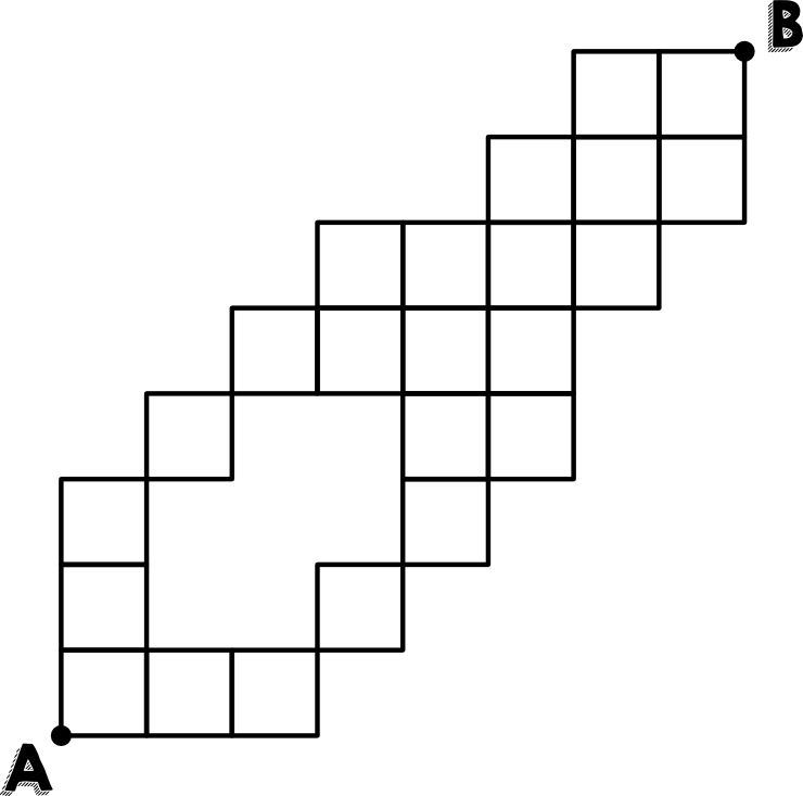 sur la figure ci-dessous, combien y a-t-il de façons de se rendre du point A au point B, en se déplaçant sur les arêtes, par un chemin de longueur minimale ?
